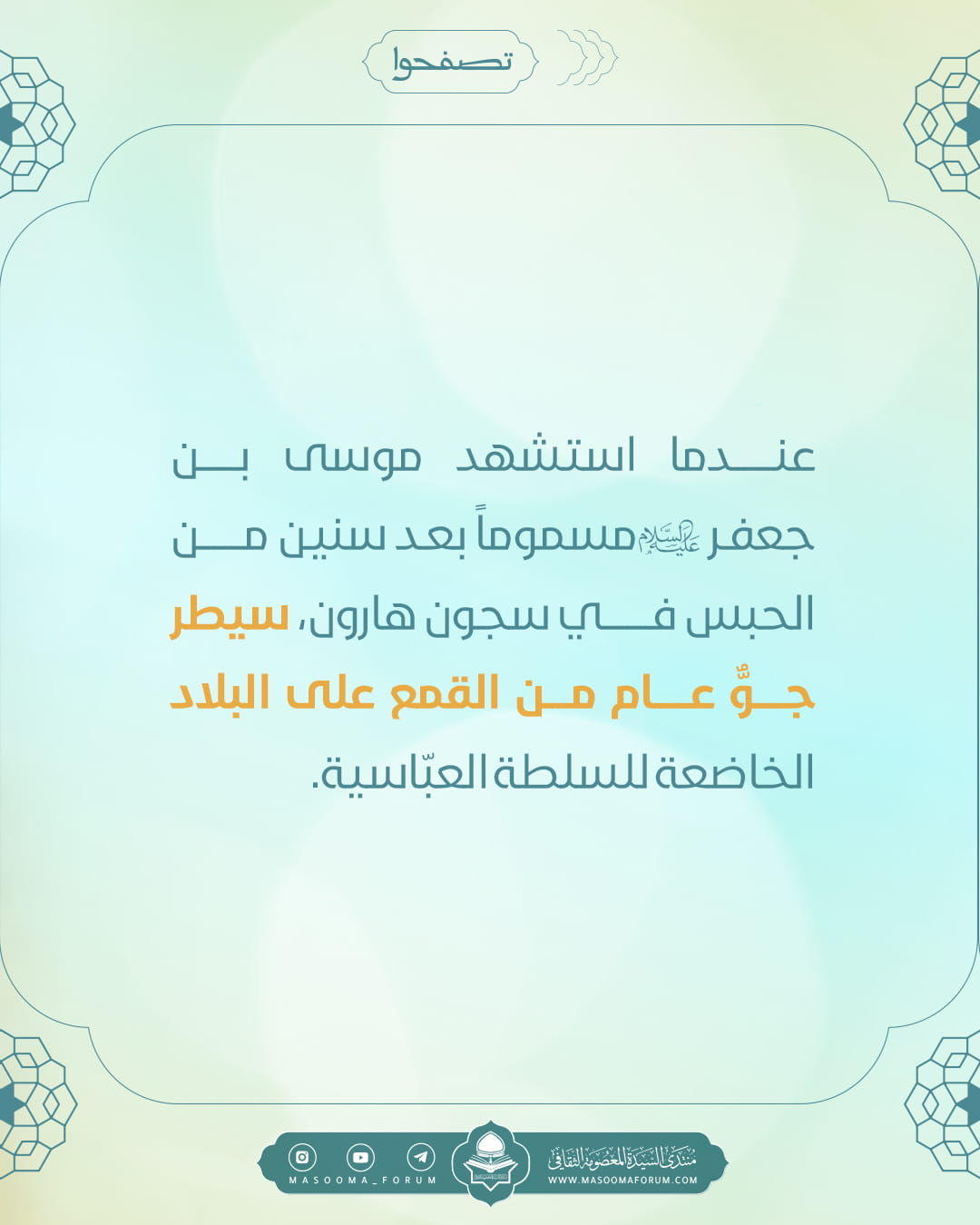 عندما استشهد موسى بن جعفر عليه السلام مسموماً بعد سنين من الحبس في سجون هارون، سيطر جوٌّ عام من القمع على البلاد الخاضعة للسلطة العبّاسية.