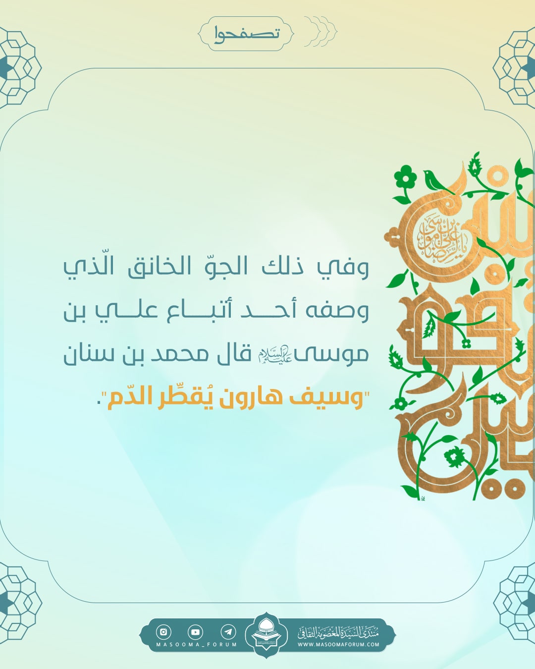 وفي ذلك الجوّ الخانق الّذي وصفه أحد أتباع علي بن موسى عليه السلام قال محمد بن سنان “وسيف هارون يُقطِّر الدّم“1.