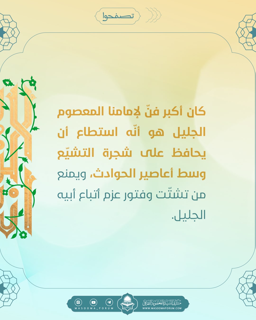 كان أكبر فنّ لإمامنا المعصوم الجليل هو أنّه استطاع أن يحافظ على شجرة التشيّع وسط أعاصير الحوادث، ويمنع من تشتّت وفتور عزم أتباع أبيه الجليل.