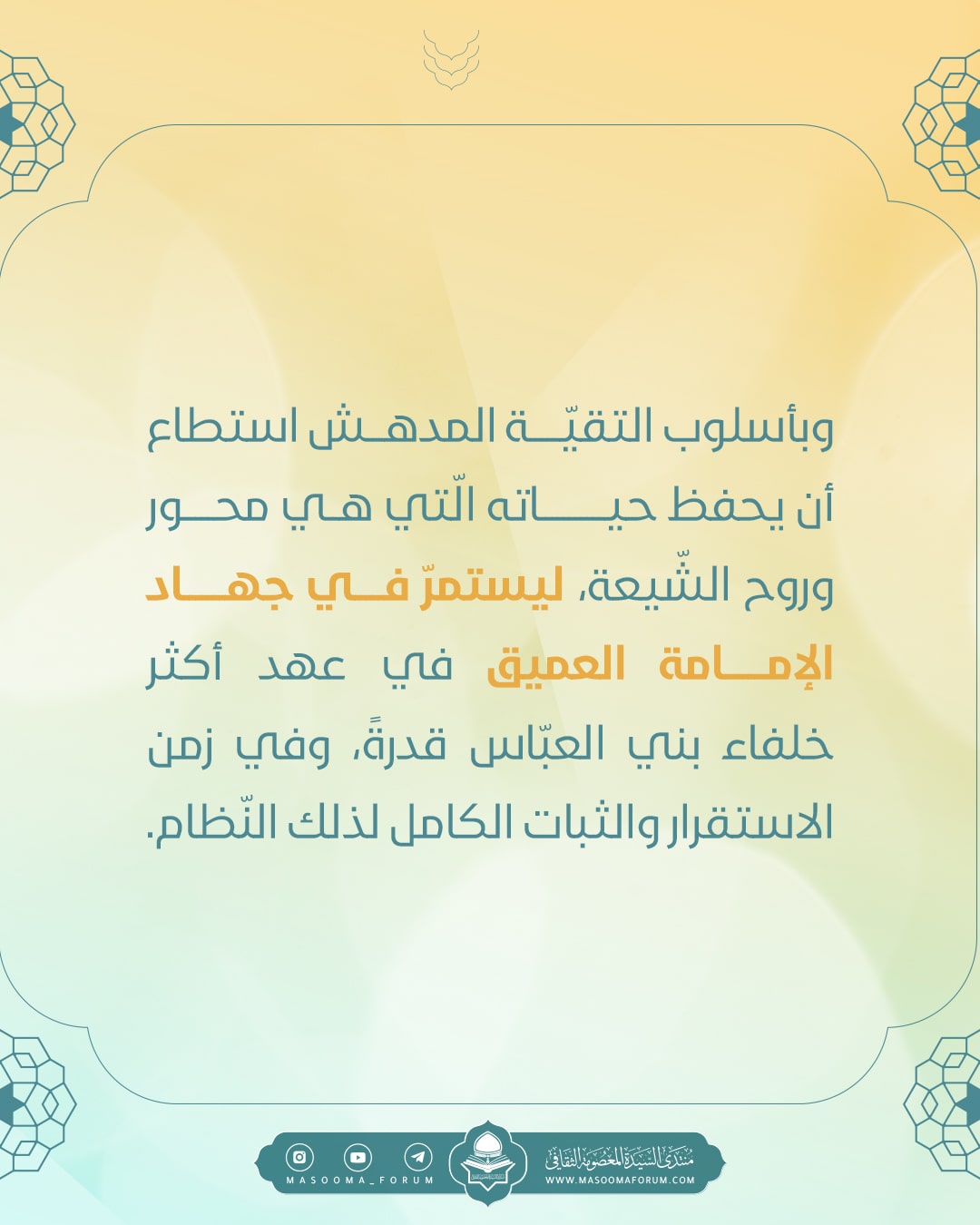 وبأسلوب التقيّة المدهش استطاع أن يحفظ حياته الّتي هي محور وروح الشّيعة، ليستمرّ في جهاد الإمامة العميق في عهد أكثر خلفاء بني العبّاس قدرةً، وفي زمن الاستقرار والثبات الكامل لذلك النّظام.