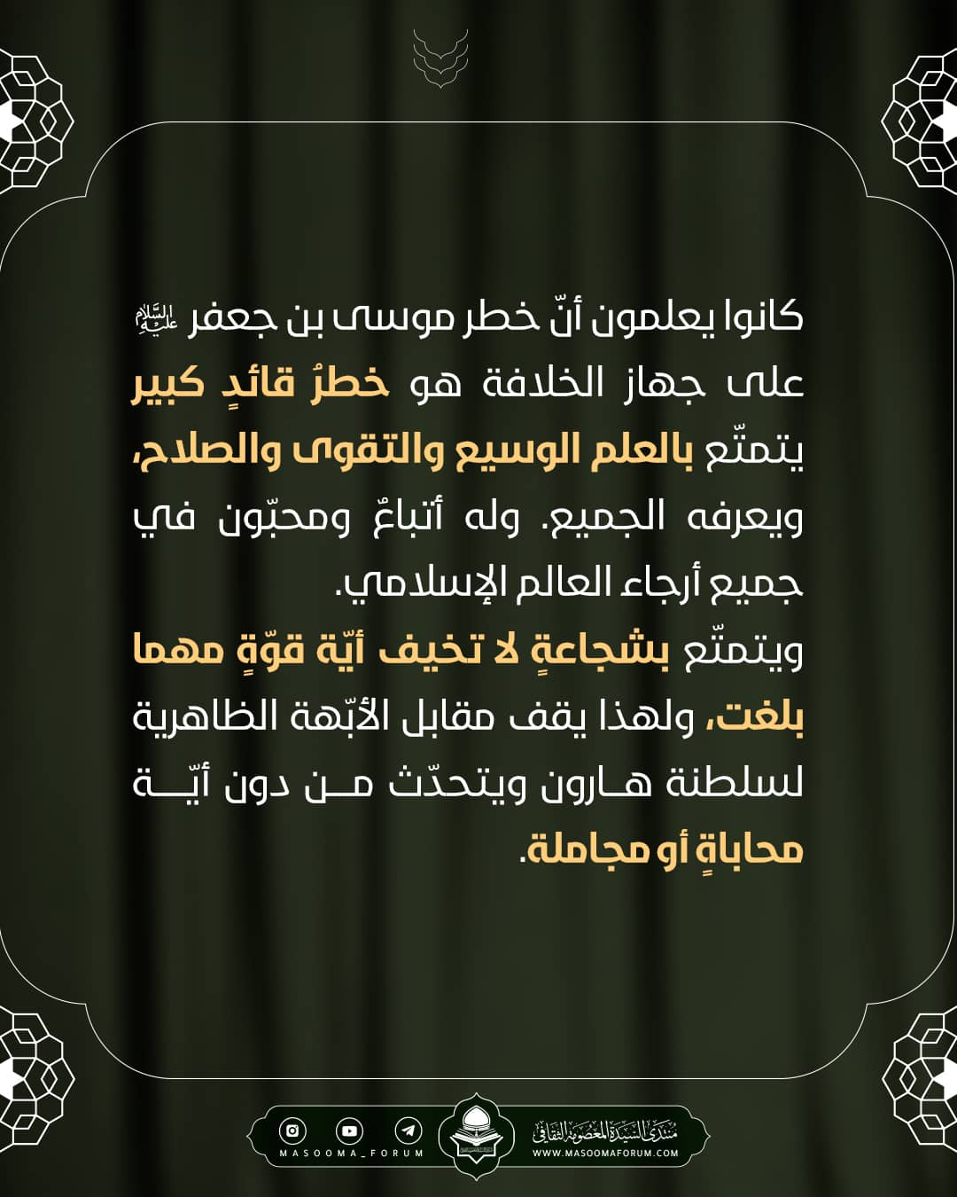 كانوا يعلمون أنّ خطر موسى بن جعفر عليه السلام على جهاز الخلافة هو خطرُ قائدٍ كبير يتمتّع بالعلم الوسيع والتقوى والصلاح، ويعرفه الجميع. وله أتباعٌ ومحبّون في جميع أرجاء العالم الإسلامي.