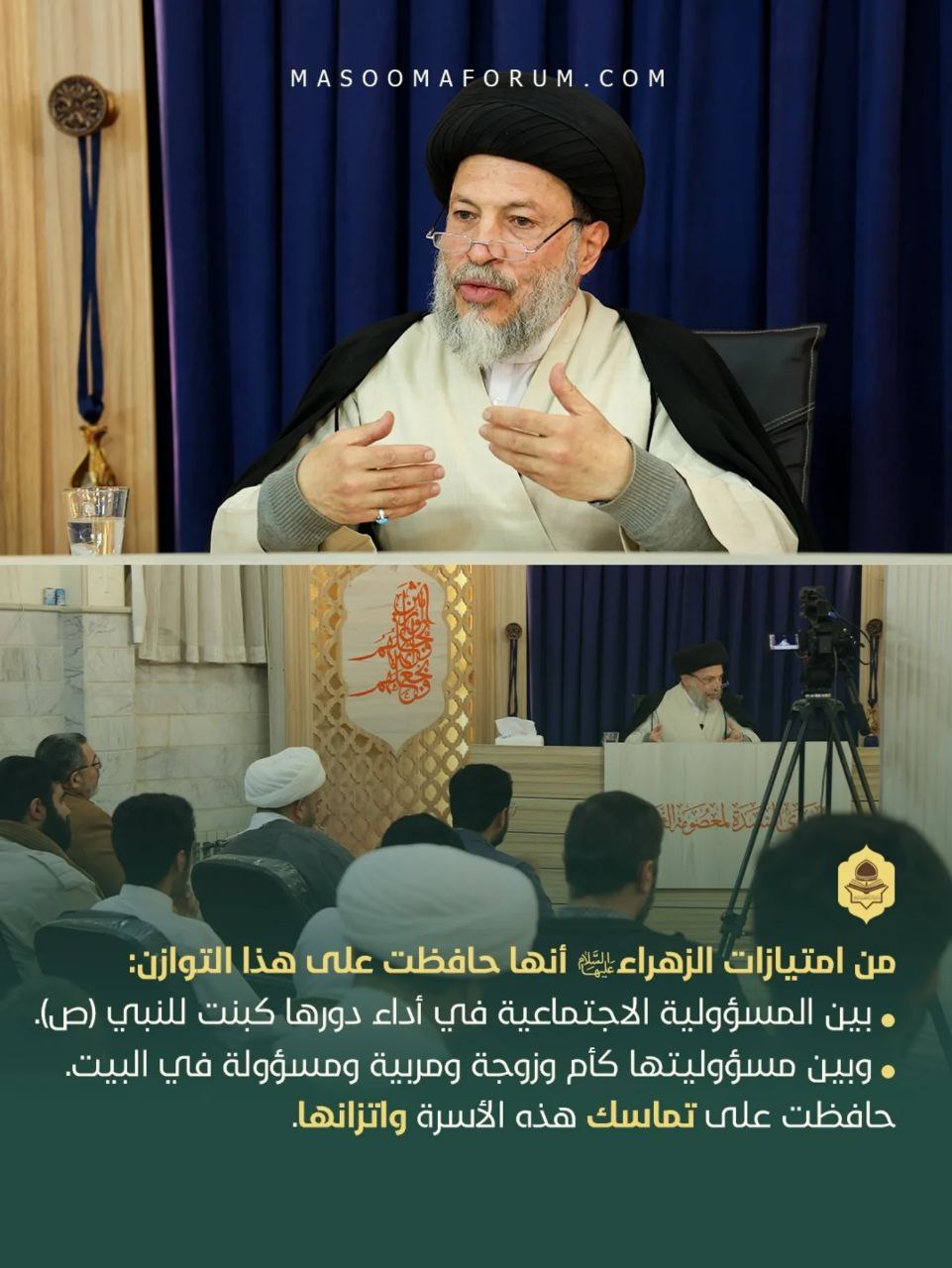 من امتيازات الزهراء عليها السلام أنها حافظت على التوازن بين مسؤوليتها الاجتماعية، وبين دورها كابنة للنبي، وزوجة، وأم، ومربية، ومسؤولة عن تماسك الأسرة واستقرارها.