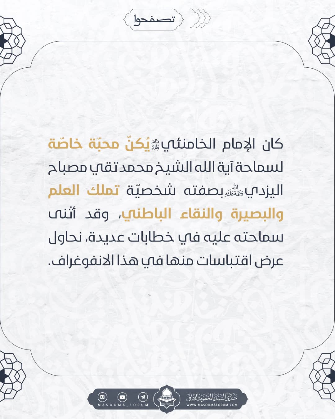 🔷 كان الإمام الخامنئي يُكنّ محبّة خاصّة لسماحة آية الله الشيخ محمد تقي مصباح اليزدي بصفته شخصيّة تملك العلم والبصيرة والنقاء الباطني، وقد أثنى سماحته عليه في خطابات عديدة، نحاول عرض اقتباسات منها في هذا الانفوغراف.