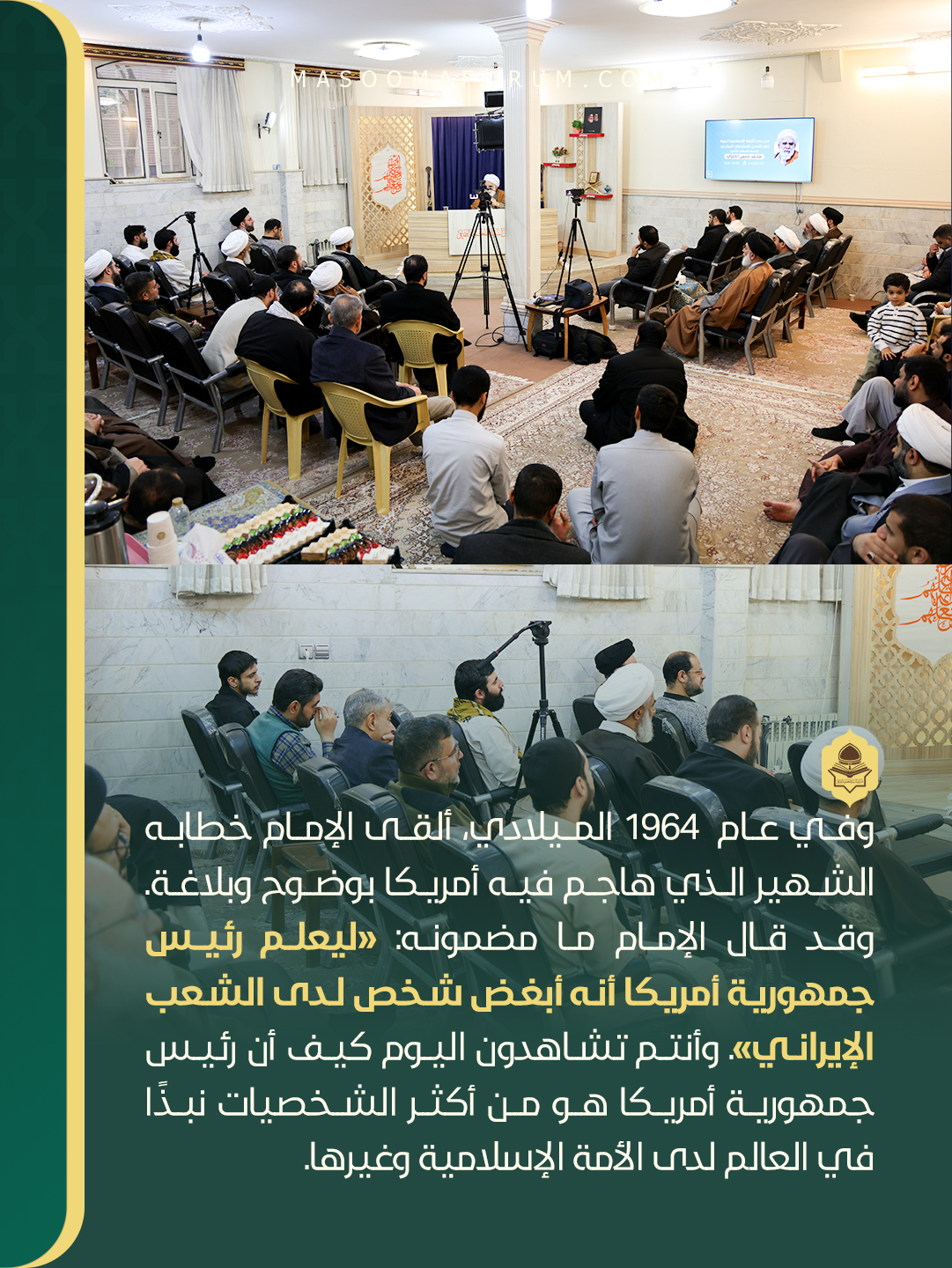 وفي عام 1343 الشمسي، الموافق لعام 1964 الميلادي، ألقى الإمام خطابه الشهير الذي هاجم فيه أمريكا بوضوح وبلاغة. وقد قال الإمام ما مضمونه: «ليعلم رئيس جمهورية أمريكا أنه أبغض شخص لدى الشعب الإيراني». وأنتم تشاهدون اليوم كيف أن رئيس جمهورية أمريكا هو من أكثر الشخصيات نبذًا في العالم لدى الأمة الإسلامية وغيرها.