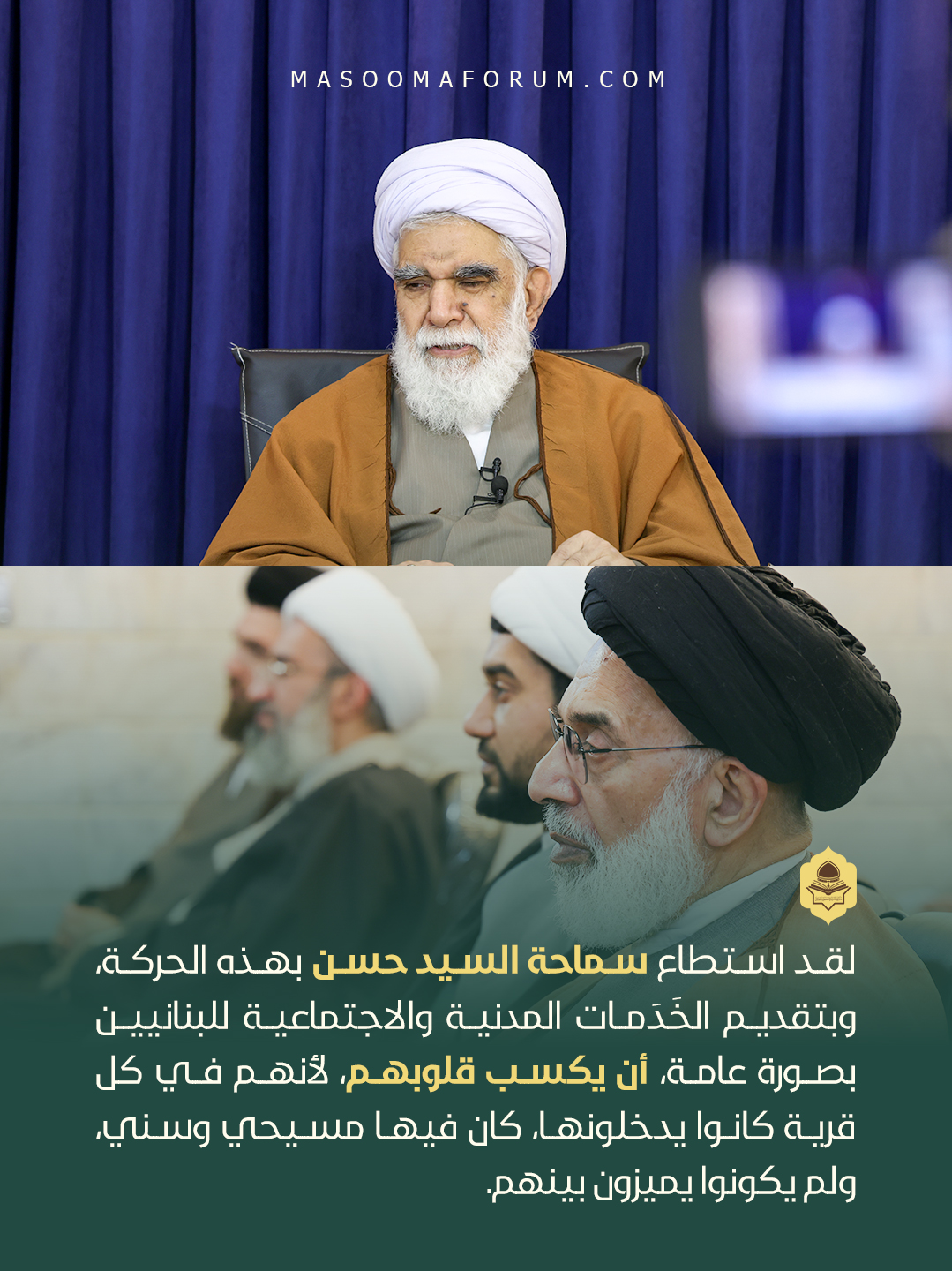 لقد استطاع سماحة السيد حسن نصر الله بهذه الحركة، وبتقديم الخَدَمات المدنية والاجتماعية للبنانيين بصورة عامة، أن يكسب قلوبهم، لأنهم في كل قرية كانوا يدخلونها، كان فيها مسيحي وسني، ولم يكونوا يميزون بينهم. لذلك، وكما قلت في جلسة سابقة، ترون مثلاً أنه في تشييع الجثمان المبارك للسيد الشهيد، حضر أكثر من مليوني شخص، أي ما يعادل 24% من الشعب اللبناني. ولم يقتصر هذا الحضور على التشييع، بل تكرر في الذكرى السنوية في تلك السنة.