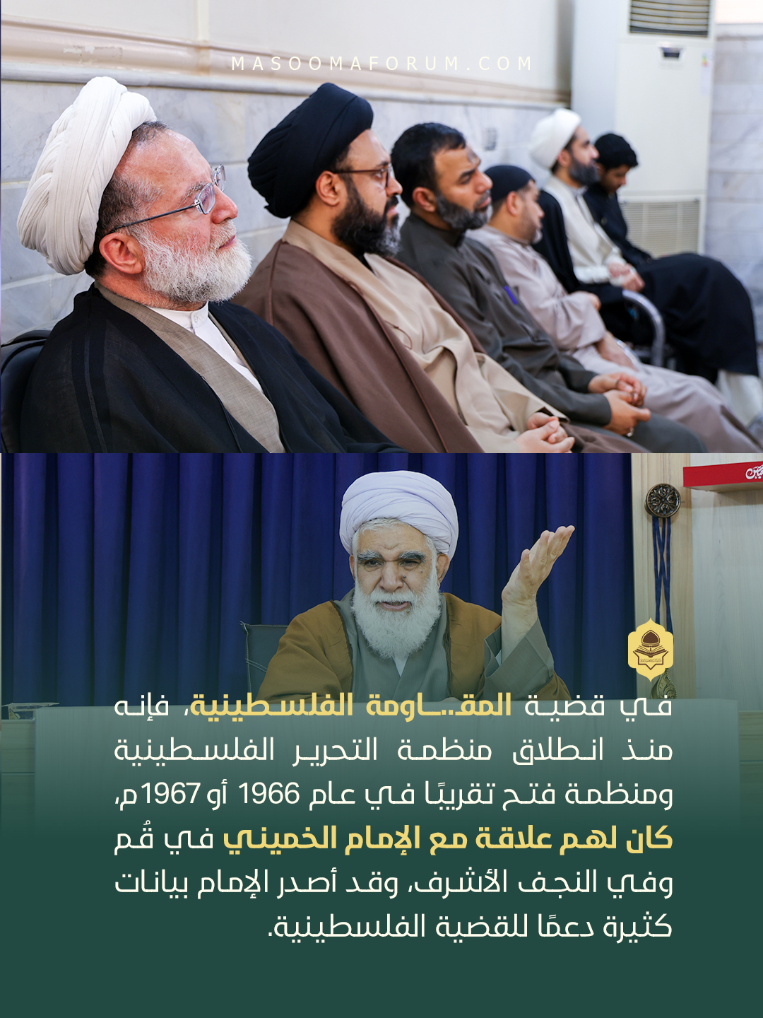 وفي تلك الأيام أيضًا، كانت منظمة فتح قد تأسست، وكانت تسعى للحصول على دعم العلماء والمشايخ للقضية الفلسطينية ولما كانت تسميه «الثورة الفلسطينية». وقد أرسلوا استفتاءات إلى كبار العلماء يطلبون فيها رأيهم في حكم مساعدة الفلسطينيين، فوجهوا رسائل إلى اثني عشر من كبار علماء أهل السنة، منهم مفتي الأزهر، وإلى عالمين من علماء الشيعة، هما الإمام الخميني وسماحة المرجع السيد محسن الحكيم رحمه الله.