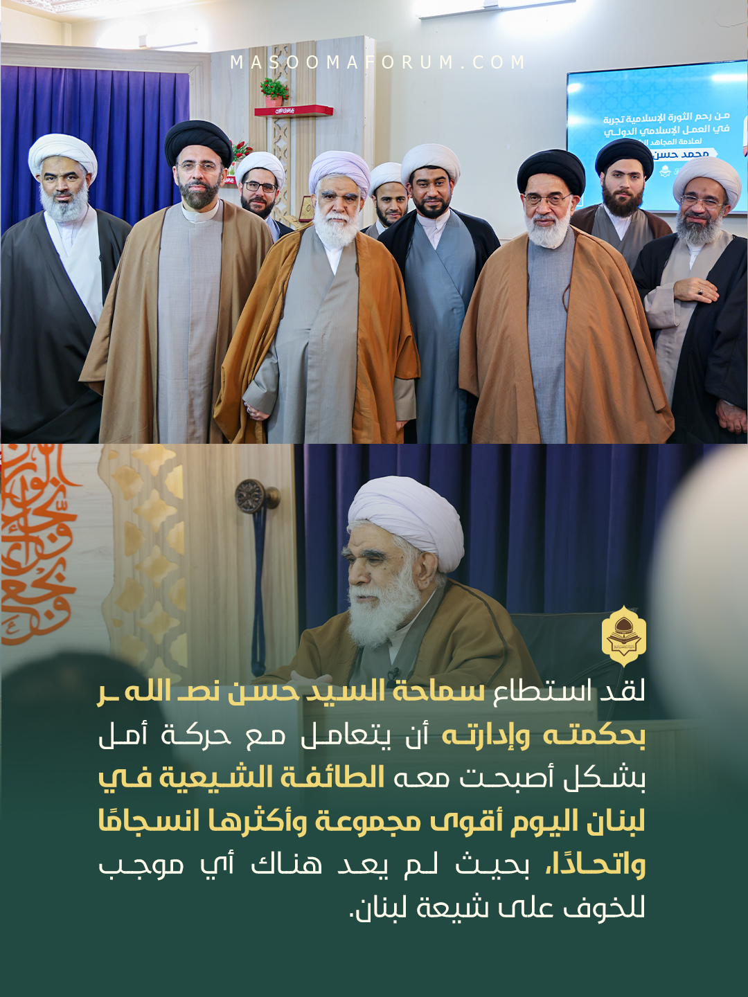 لقد استطاع سماحة السيد حسن نصر الله بحكمته وإدارته أن يتعامل مع حركة أمل بشكل أصبحت معه الطائفة الشيعية في لبنان اليوم أقوى مجموعة وأكثرها انسجامًا واتحادًا، بحيث لم يعد هناك أي موجب للخوف على شيعة لبنان. فقد أعطى سماحة السيد حسن القيادة السياسية لنبيه بري، وأبقى القيادة الميدانية للمقاومة لنفسه، وبهذا استطاع أن يرضي جميع الأطراف ويجمعهم.